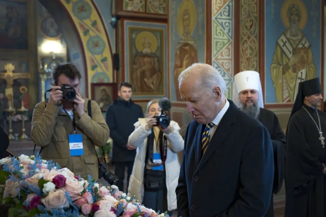 Байден и Зеленский посетили Свято-Михайловский Златоверхий монастырь в Киеве. Они ознакомились с историей храма и их функционированием во времена российского вторжения. Президенты Украины и США также возложили цветы к Стене памяти погибших за Украину, расположенной у Свято-Михайловского Златоверхого монастыря. Зеленский и Байден почтили память украинских героев минутой молчания.