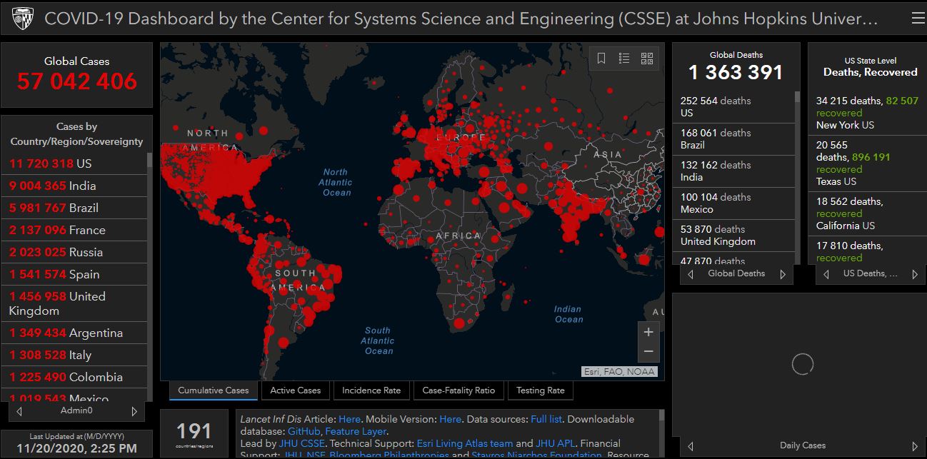 Так, по данным института системных исследований и инжиниринга Университета Джонса Хопкинса, состоянием на 16:00 20 ноября зафиксировано 57 042 406 случаев COVID-19. Умер 1 363 391 пациент.