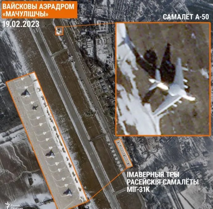 К слову, появился спутниковый снимок военного самолёта А-50 на аэродроме под Минском. Вероятно, именно его атаковали 26 февраля. Снимок сделан 19 февраля. Как сообщает «Радио свобода», на фото видно, где мог находиться самолёт А-50 в момент удара Кроме того, спутник зафиксировал ещё несколько российских самолётов, которые издание идентифицировало как МиГ-31К.