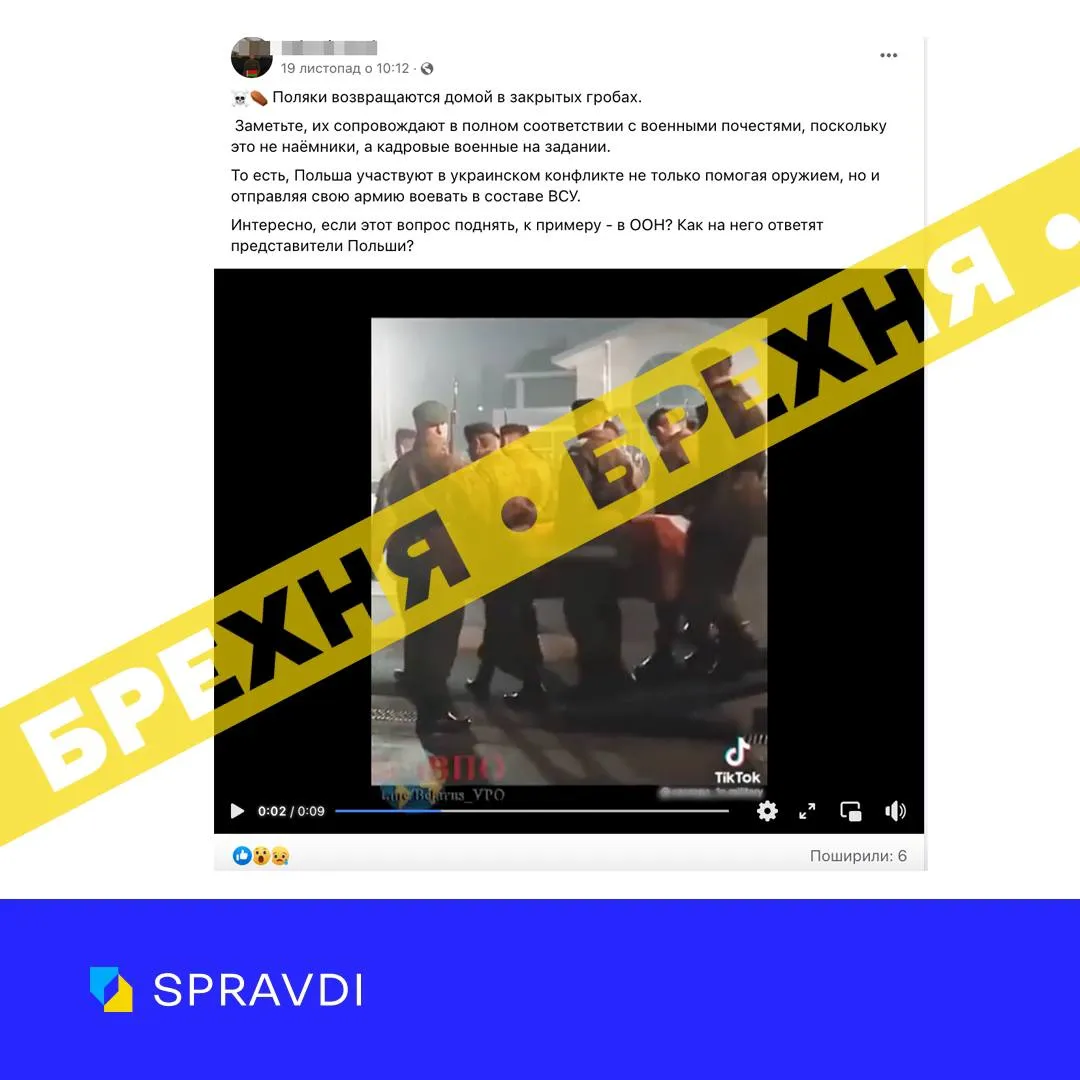 Об этом рассказали в Центре стратегических коммуникаций. Наиболее активно запись распространяют пророссийские Z-каналы. На записи можно увидеть, как польские военные несут гроб. Вероятно, в нём находится их сослуживец. Авторы публикаций заявляют, будто польские военные уже полноценно воюют в Украине, а затем их хоронят дома с военными почестями.