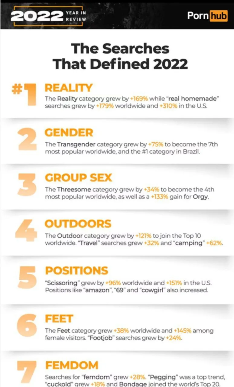 Порносайт Pornhub подвел итоги 2022 года. Согласно отчету, в этом году главным запросом стало реалити, поскольку люди «все еще стремятся к настоящему домашнему порно». Следующими популярными темами стали гендер (категория трансгендеры), групповой секс, на открытом воздухе (этому поспособствовала пандемия коронавируса), позы, ноги (возбуждение от стимуляции ног назвали главным фетишем 2022 года) и фемдим.