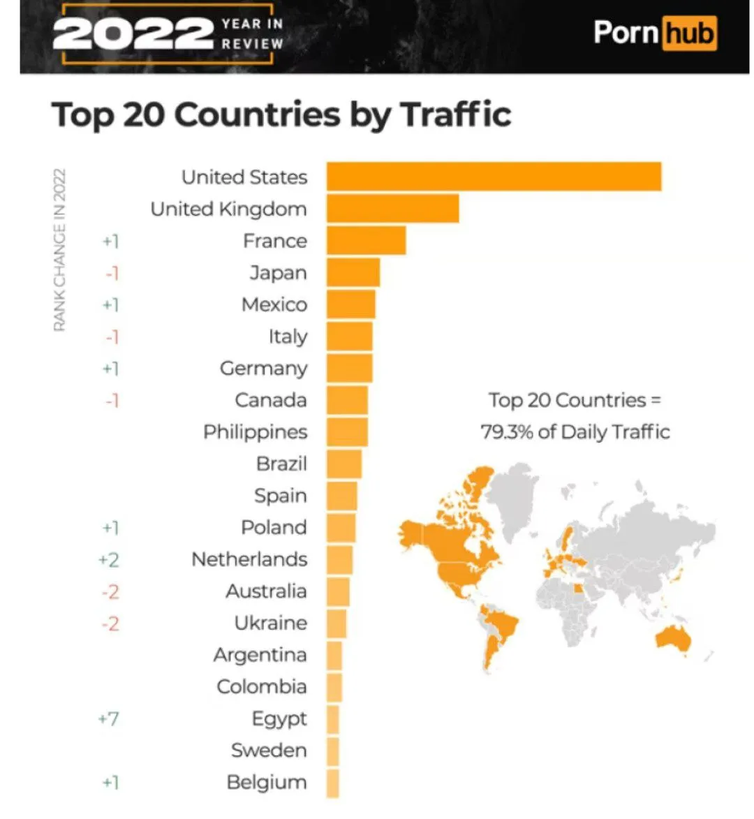 По данным сайта Украина занимает 15 место в топ-20 стран по просмотру Pornhub. Однако через год потеряла две позиции в этом рейтинге.