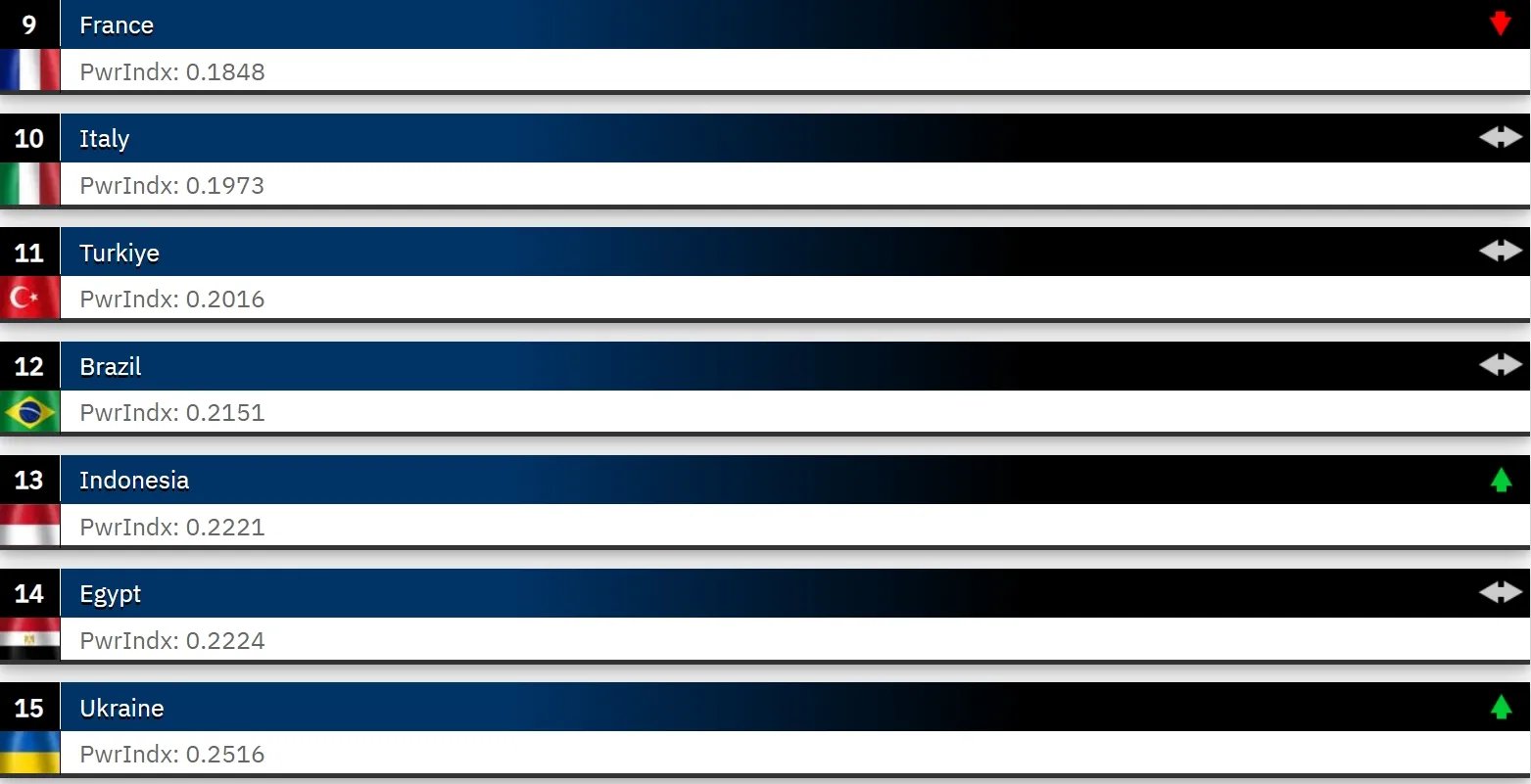 В 2023 году Украина переместилась на 15-е место. Для сравнения, в прошлогоднем рейтинге она занимала 22 ступень. Также позицию сменила Великобритания с 7 места на 5. В то же время французская армия спустилась с 7 места на 9.