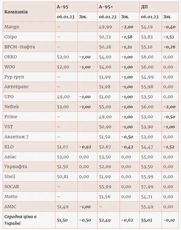 Дороже всего А-95+ отпускают на АЗС сети Socar – за 55,99 грн/л, дешевле – за 49 грн/л – в сети Prime, тогда как средняя цена составляет 52,49 грн/л. Что касается дизельного горючего, то больше всего – 2 грн/л – оно потеряло на автозаправочных станциях сети «Нефтек». Меньше всего ДТ подешевело – на 26 коп./л – на АЗС «БРСМ-Нефть». Дороже всего дизтопливо продает сеть Socar – за 57,99 грн/л, премиум-сети ОККО и WOG, а также «Нефтек» держат цену на уровне 56 грн/л.