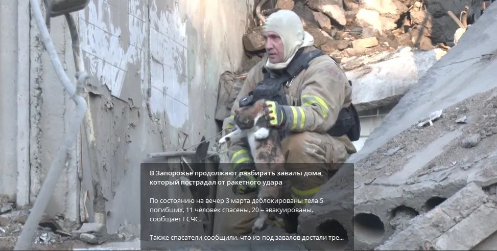 Напомним, в ночь на 2 марта российская ракета попала в 5-этажку в центре Запорожья. Большинство жителей спали. Прямым попаданием уничтожено более 10 квартир в доме от второго до пятого этажа.